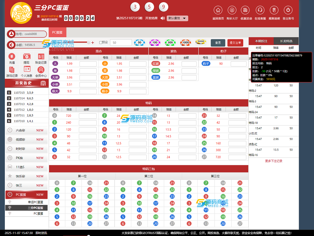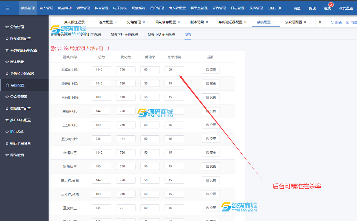 后台功能强大,后台带有系统彩控制概率,可以设置中盈概率杀、预设开奖、修改开奖结果等等
